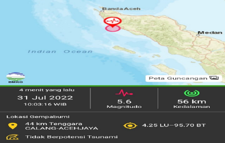 “Gempa bumi ini tidak berpotensi tsunami,” kata prakirawan Stasiun BMKG Meulaboh-Nagan Raya, Angga Yudha yang dihubungi di Meulaboh, Ahad (31/07/2022).