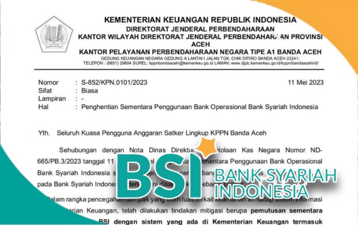 Banda Aceh, TERASMEDIA.NET – Kepala Pelayanan Perbendaharaan Negara Banda Aceh (KPPN Banda Aceh) menghentikan sementara BSI sebagai mitra pemerintah dalam penyaluran dana APBN yang disebabkan oleh gangguan sistem yang terjadi pada BSI.